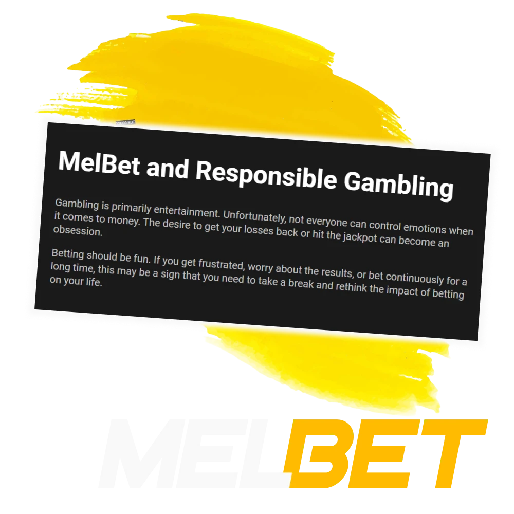 আমরা কঠোরভাবে দায়িত্বশীল গেমিং নিয়ম মেনে চলি, কারণ অপ্রাপ্তবয়স্কদের অংশগ্রহণ নিষিদ্ধ এবং বিজ্ঞাপন শিশু বা দুর্বল ব্যক্তিদের উদ্দেশ্যে নয়। আপনার নিরাপদ জুয়া খেলার অভিজ্ঞতা নিশ্চিত করার জন্য Melbet স্পষ্ট নিয়ম এবং ব্যবহারিক সরঞ্জামগুলির একটি সেট অফার করে: